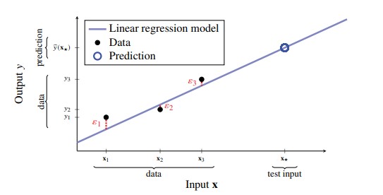 Figure 1 - Linear Regression with p=1. Black dots represent data-points, blue line represents learned regression model. Model doesn’t fit data perfectly, so remaining error corresponding to random noise ε for each data-point is shown in red. The model can be used to predict (blue circle) the output ŷ=𝐱★ for a test input 𝐱★
