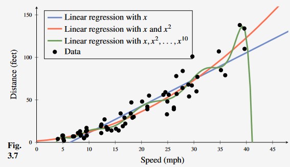 Learning the car stopping distance with linear regression, second-order polynomial regression and 10th order polynomial regression. From this, we can see that the 10th degree polynomial is over fitting to outliers in the data making it less useful than even ordinary linear regression (blue).