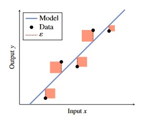 - Goal is to choose the model (blue line) such that the sum of squares (denoted in light red) of each error