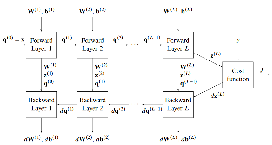 - An algorithm that efficiently computes the cost function and its gradient with respect to all parameters in the neural network