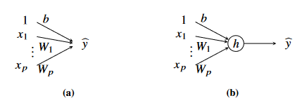 Figure 1 - (a) Graphical illustration of linear regression model and (b) generalised linear regression model. In (a), the output is the sum of all terms, b and the weighted inputs. In (b), the output is the sum of all terms, b and the weighted inputs passed through a non-linear activation function h