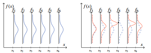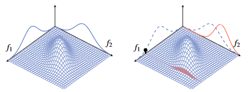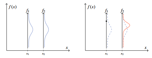 Figure 1 - Gaussian distribution for random variables f1 and f2 before and after sampling a value.