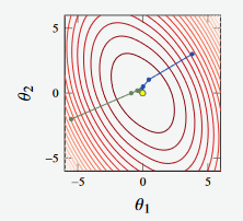 In the example above, we see two attempts (green and blue lines) to reach some global minima.