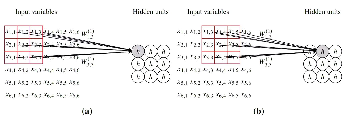 - Sparse Interactions: Lining up the input matrix with the hidden matrix, only a limited local region of inputs are connected to each hidden unit, in which the borders are typically handled with zero-padding.