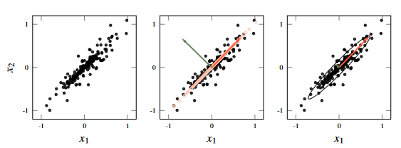 The third plot shows an ellipse fitted to the covariance matrix of the data.